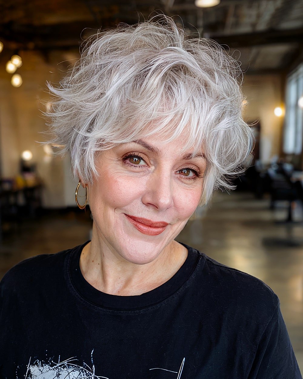 Embrace natural beauty through silver hair showcased in textured pixie cuts that celebrate mature hair color with contemporary styling. This sophisticated approach features a pixie cut with extra texture and height at the crown, creating flattering proportions while showcasing beautiful silver tones. The textured crown adds volume and modern appeal while the silver color provides natural elegance and confident style expression. This stylish fall hair trends for seniors option celebrates natural aging with contemporary flair.
