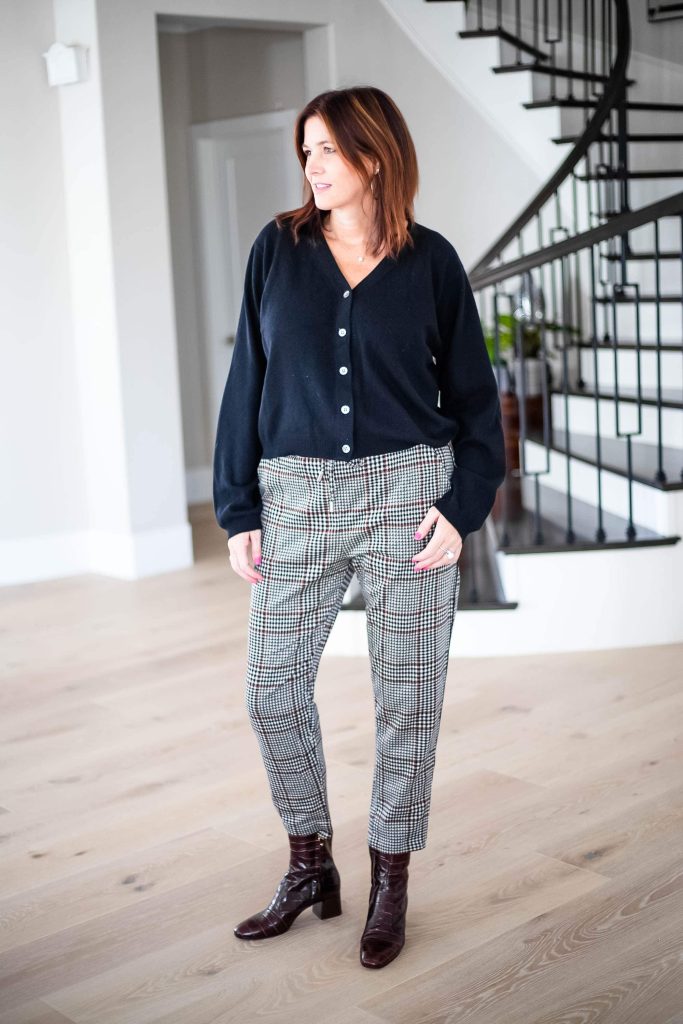 Plaid pants are a fun, unexpected choice for a night out. Pair them with a cropped sweater and chunky boots for a look that’s playful, comfortable, and perfect for bar hopping or a casual date.