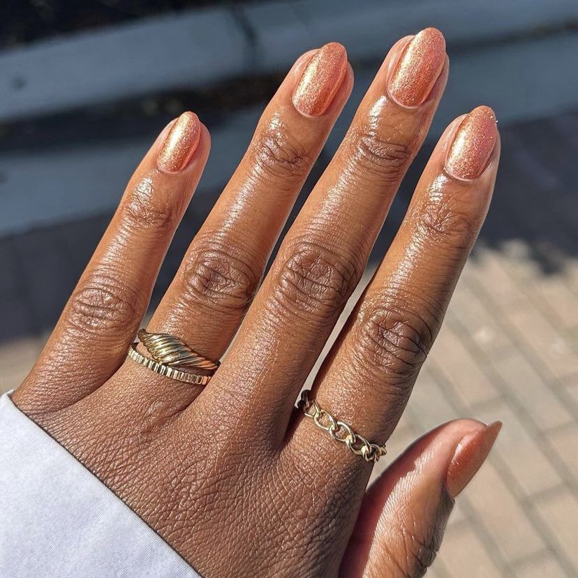 Gunmetal is a sleek and futuristic shade that is a must-try for 2025. This metallic gray has a hint of shimmer and a deep, complex finish that looks incredibly high-fashion. On dark skin, shimmering gunmetal nail polish provides a cool, edgy contrast that feels modern and luxurious. It’s a great choice for a night out or when you want to add a bit of sparkle to your look without a full glitter polish.