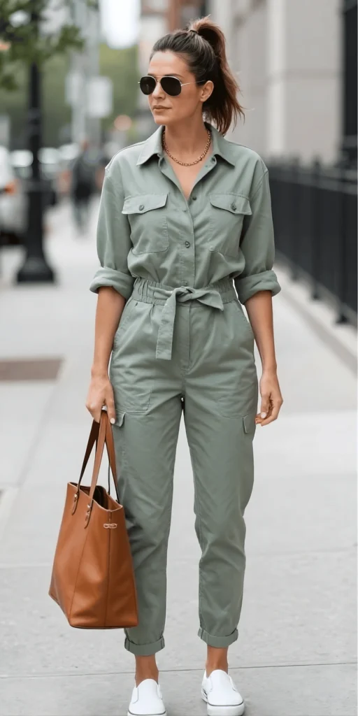 Sage Utility Jumpsuit with White Sneakers and Brown Tote