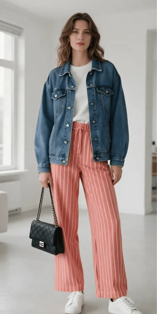 Stripes are having a major moment this spring, and this outfit shows just how versatile they can be. The coral and white striped wide-leg pants are the star of the show, bringing color, pattern, and movement to the look. They’re relaxed and flowing, with a high-waisted fit that flatters every body type. Paired with a simple white tee and an oversized denim jacket, the outfit feels balanced and effortlessly cool.