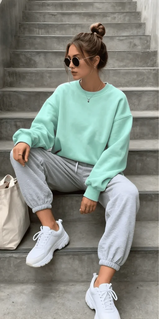 Sometimes, the most stylish outfits are the most comfortable, and this one is living proof. The mint green sweatshirt is oversized and cozy, with a relaxed fit that feels like a warm hug. Paired with gray joggers, the outfit is the ultimate in casual comfort, perfect for weekend mornings, coffee runs, or just lounging around in style. The combination of mint and gray is soft and soothing, creating a look that feels calm and put together.
