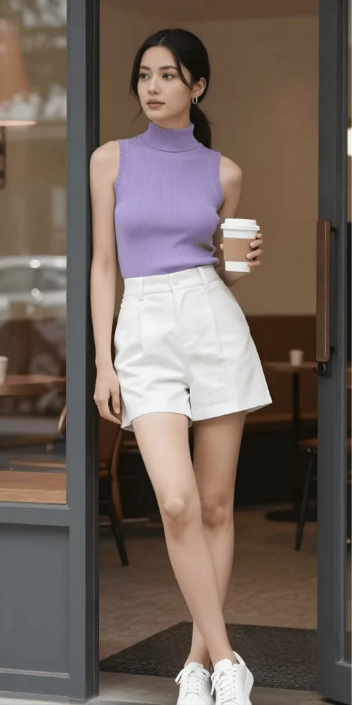 Lavender is one of the most beautiful pastel shades for spring, and this outfit showcases it perfectly. The sleeveless ribbed turtleneck in lavender is form-fitting and polished, with a modern silhouette that feels fresh and sophisticated. It’s tucked into high-waisted white tailored shorts, creating a clean, crisp look that’s perfect for warmer days. The contrast between the soft lavender and the bright white is striking and elegant.