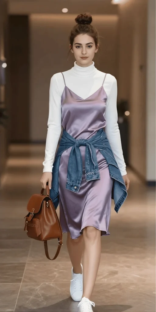 Layering is an art form, and this outfit is a masterclass. The white ribbed turtleneck layered under a lilac satin slip dress creates a look that’s feminine, modern, and unexpectedly cool. The slip dress has a relaxed, flowing silhouette that feels romantic and effortless, while the turtleneck adds warmth and structure. A denim jacket is tied around the waist, adding a casual, street style edge that makes the outfit feel lived-in and approachable.