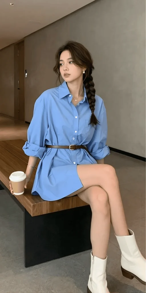 There’s something effortlessly chic about a shirt dress, and this one nails the look. The oversized light blue button-up dress has a relaxed, boyfriend-fit silhouette that feels comfortable and cool. A slim brown leather belt cinches the waist, creating shape and adding a touch of polish. The dress is worn slightly oversized, with the sleeves rolled up casually, giving the outfit a laid-back, lived-in vibe.