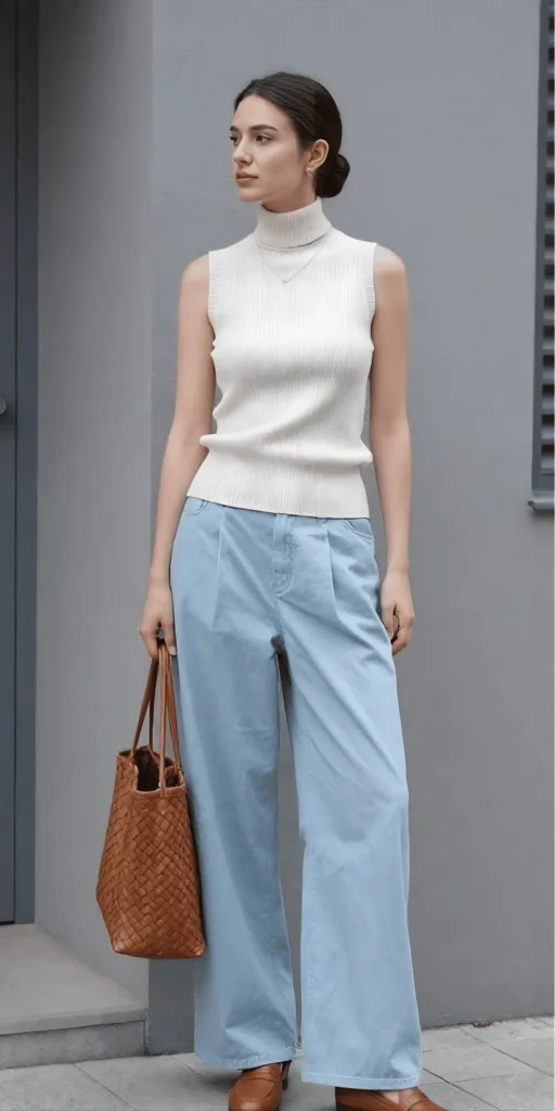 Neutral tones and soft blues come together beautifully in this understated yet incredibly chic outfit. The cream ribbed sleeveless turtleneck is form-fitting and elegant, with a high neckline that adds a touch of sophistication. Tucked into light blue wide-leg jeans, it creates a silhouette that’s both flattering and comfortable. The jeans have a relaxed, flowing fit that feels modern and effortless, perfect for casual spring outfits with wide-leg jeans.