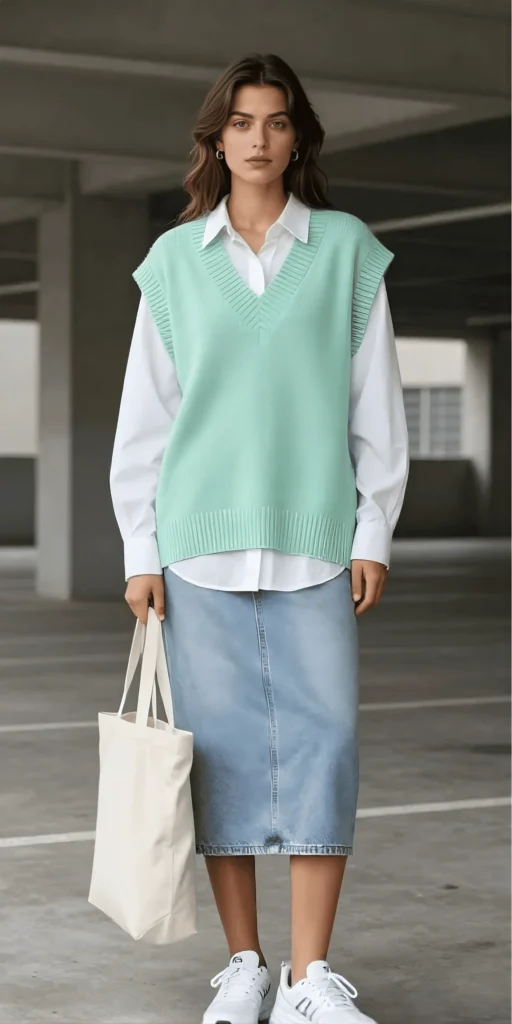 Mint Sweater Vest Over White Shirt with Denim Midi Skirt
