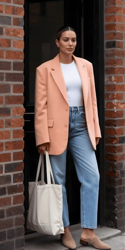 What makes this outfit so special is its adaptability. You can dress it up with heels and a silk blouse, or keep it casual with sneakers and a tee. The peach blazer is a statement piece that adds color and personality to your wardrobe, and it works beautifully with just about anything. It’s a chic, comfy spring outfit that proves color can be just as versatile as neutrals.