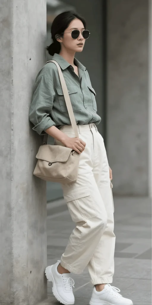 Sage Utility Shirt with Cream Cargo Pants and White Sneakers