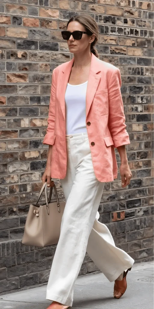 Color is back in a big way this spring, and this outfit is a beautiful example of how to wear it with confidence. The coral blazer is bold, fresh, and undeniably eye-catching. It’s the kind of statement piece that instantly elevates any outfit, and when paired with a simple white tee and wide-leg cream pants, it creates a look that’s polished but never stuffy. The color combination is soft and sophisticated, evoking a sense of warmth and approachability.
