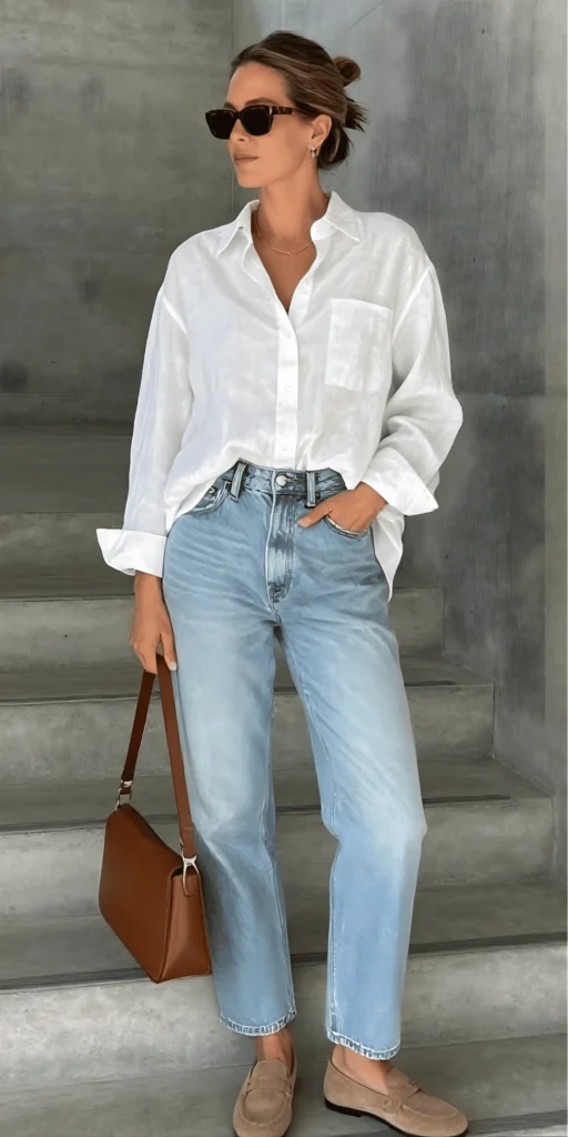 Oversized White Button-Up with Light Wash Jeans and Tan Loafers