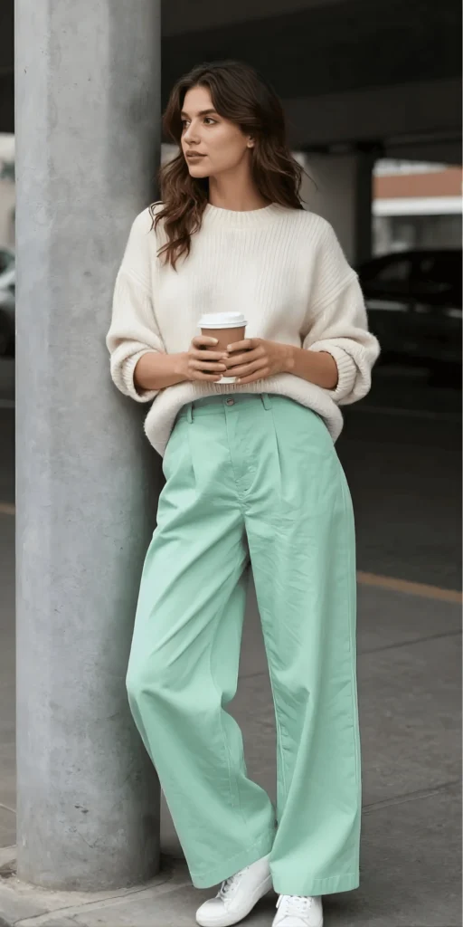 Cream Ribbed Sweater with Mint Wide-Leg Pants and White Sneakers