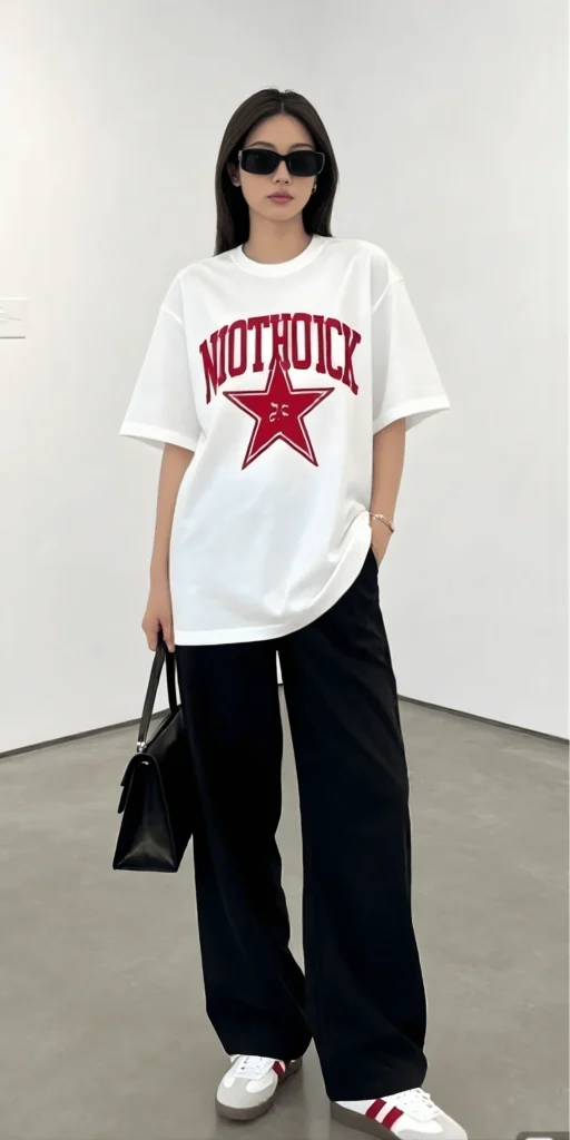 Sporty chic is having a major moment, and this outfit nails the aesthetic. The oversized white graphic tee—featuring a bold collegiate-style print in red and black—is the kind of piece that adds instant personality to any look. It’s casual, comfortable, and just the right amount of cool. Paired with black wide-leg pants, the outfit strikes a perfect balance between relaxed and refined. The wide-leg silhouette elongates the legs and adds a touch of elegance, even in a super casual context.