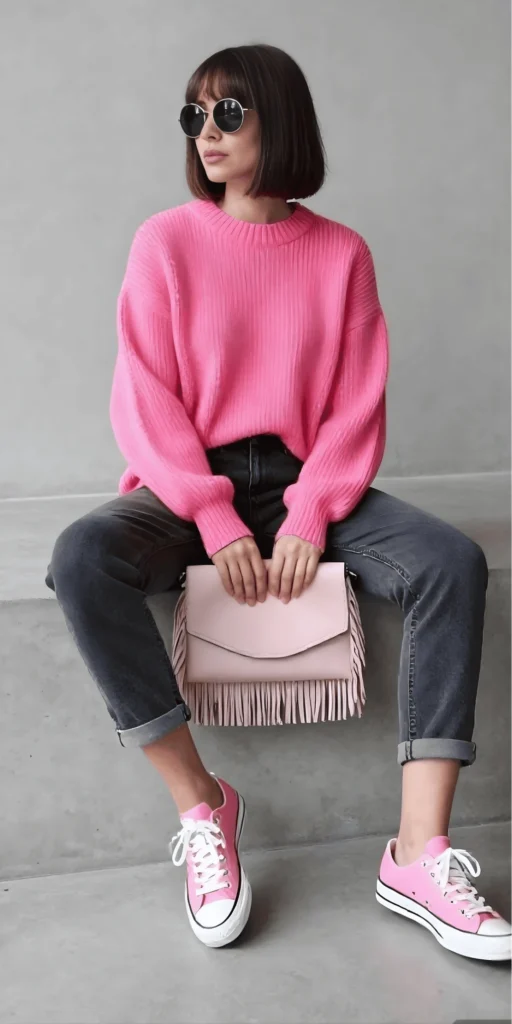 Matching your sneakers to your sweater is a styling trick that always works, and here it ties the outfit together beautifully. The pink Converse-style sneakers are classic, comfortable, and perfect for a full day on your feet. The blush pink fringe bag adds texture and dimension, making the outfit feel more curated and less thrown together. And those round sunglasses? They bring a hint of retro charm that completes the look.