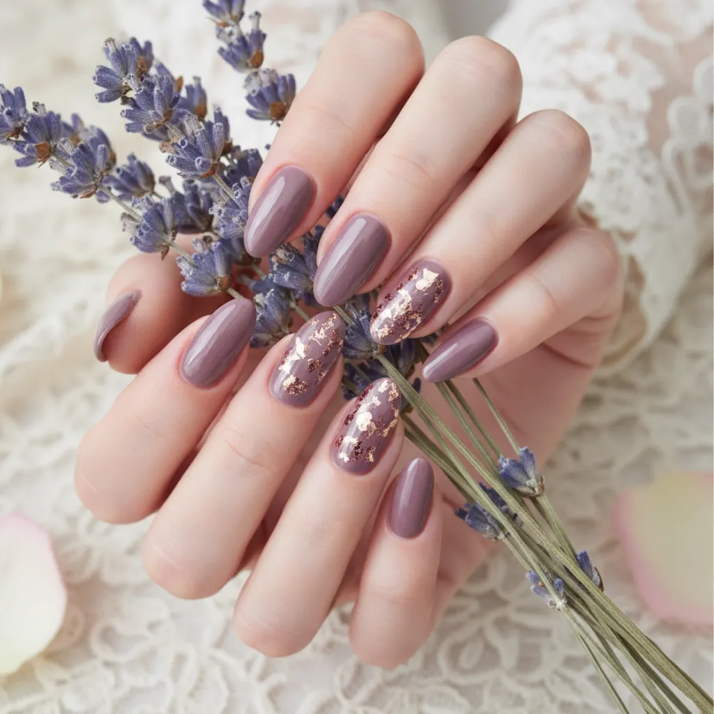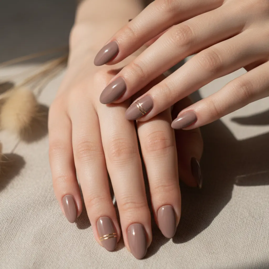 Mauve taupe emerges as fall 2025’s most versatile neutral, offering a sophisticated alternative to traditional nude shades that feels distinctly autumnal. This complex color combines the warmth of taupe with subtle purple undertones, creating a shade that’s neither too pink nor too brown. The result is a universally flattering color that works as both a standalone shade and a base for nail art. Short nails particularly benefit from mauve taupe’s elongating properties, creating a polished look that’s appropriate for any setting while still feeling special enough for the season.