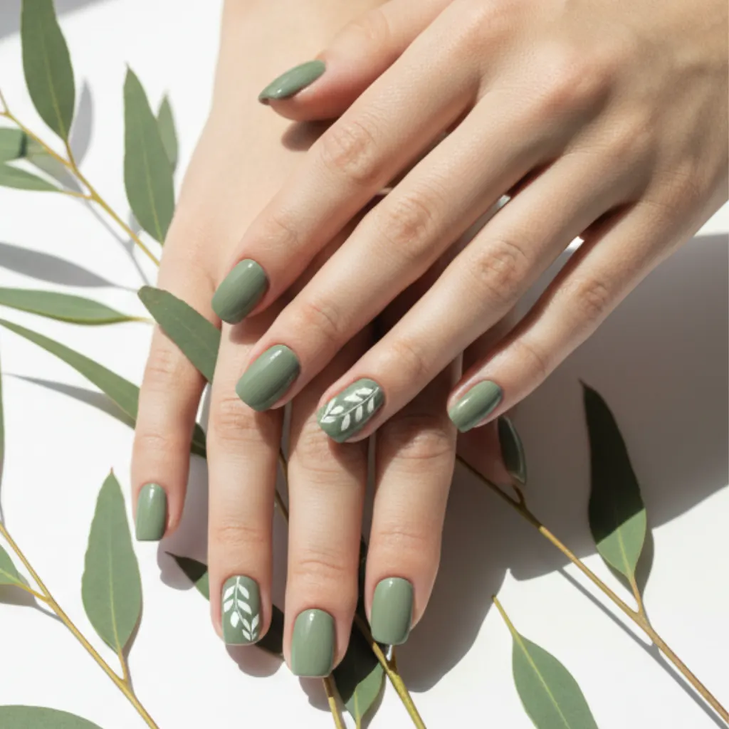 Sage green emerges as fall 2025’s most wearable unconventional choice, offering a muted alternative to traditional autumn shades that still feels seasonally appropriate. This greyish-green tone captures the essence of late fall foliage while maintaining a sophisticated neutrality that works with any wardrobe. The subdued nature of sage makes it perfect for those who want to experiment with color without committing to anything too bold. On short nails, sage green creates a fresh, modern look that feels both professional and creative, striking the perfect balance for those who want something different from typical fall colors.