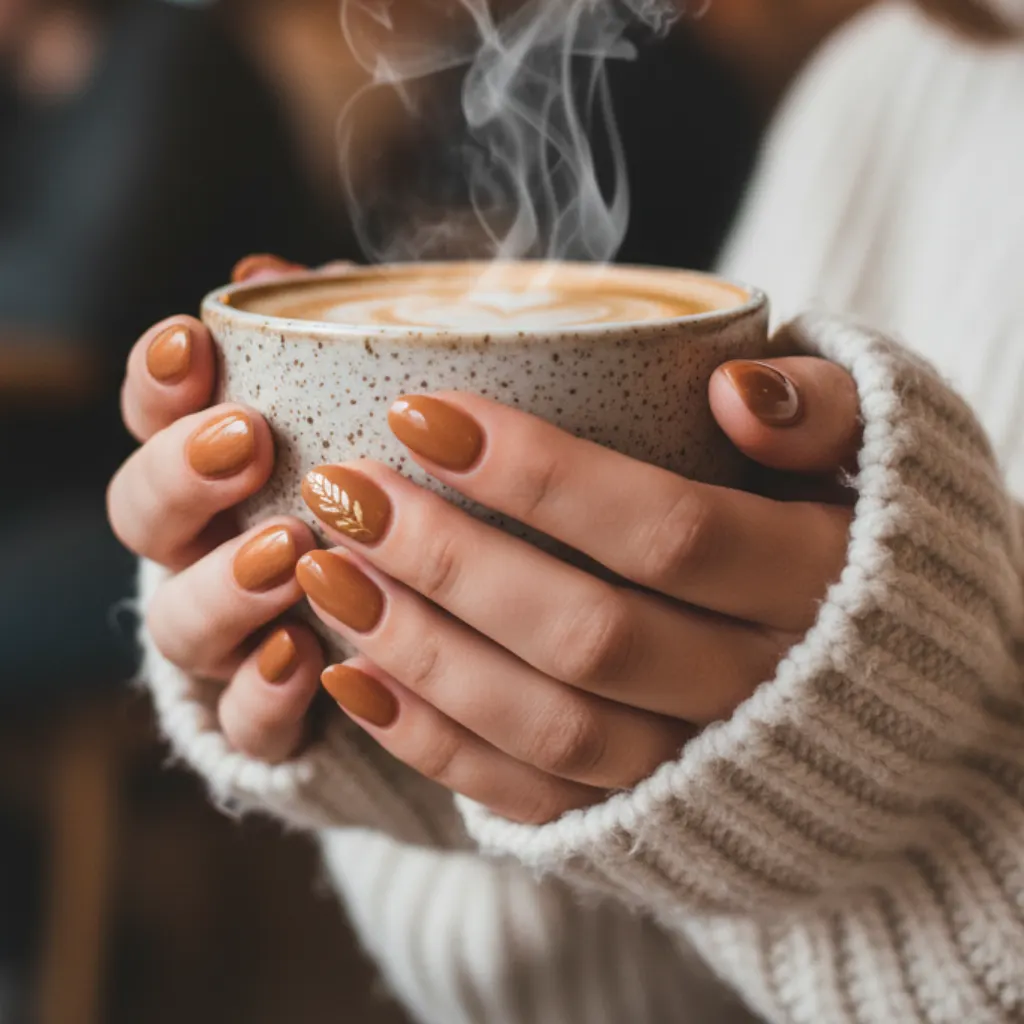 Almond nail designs featuring warm caramel often incorporate tonal variations that add depth without overwhelming. Consider creating an ombré effect that transitions from light caramel at the base to deeper toffee at the tips, mimicking the multi-tonal quality of actual caramel. Trending manicure ideas frequently feature caramel paired with unexpected accent colors – a single nail in deep teal or burgundy creates visual interest while maintaining overall wearability. For seasonal nail art, try incorporating delicate gold leaf accents or creating abstract swirl patterns that blend caramel with cream and chocolate brown. This versatile shade demonstrates that the best nail polish shades for fall don’t always need to be bold to make a stylish statement.