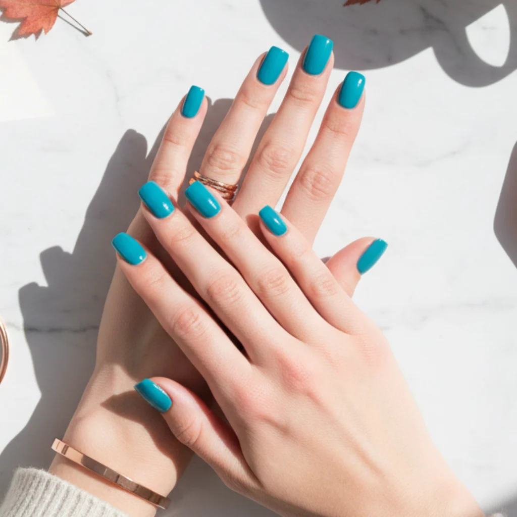 Breaking away from traditional autumn palettes, electric teal emerges as fall 2025’s most surprising trend, bringing unexpected vibrancy to the season’s nail landscape. This bold shade challenges conventional fall wisdom by introducing a cool-toned pop of color that surprisingly complements autumn’s warm palette. The key to making teal work for fall is choosing shades with depth – think peacock-inspired teals with hints of green rather than bright pool-water blues. On short nails, electric teal creates a modern, edgy look that pairs beautifully with fall’s neutral wardrobe staples, acting as an unexpected accent that draws attention to your hands.