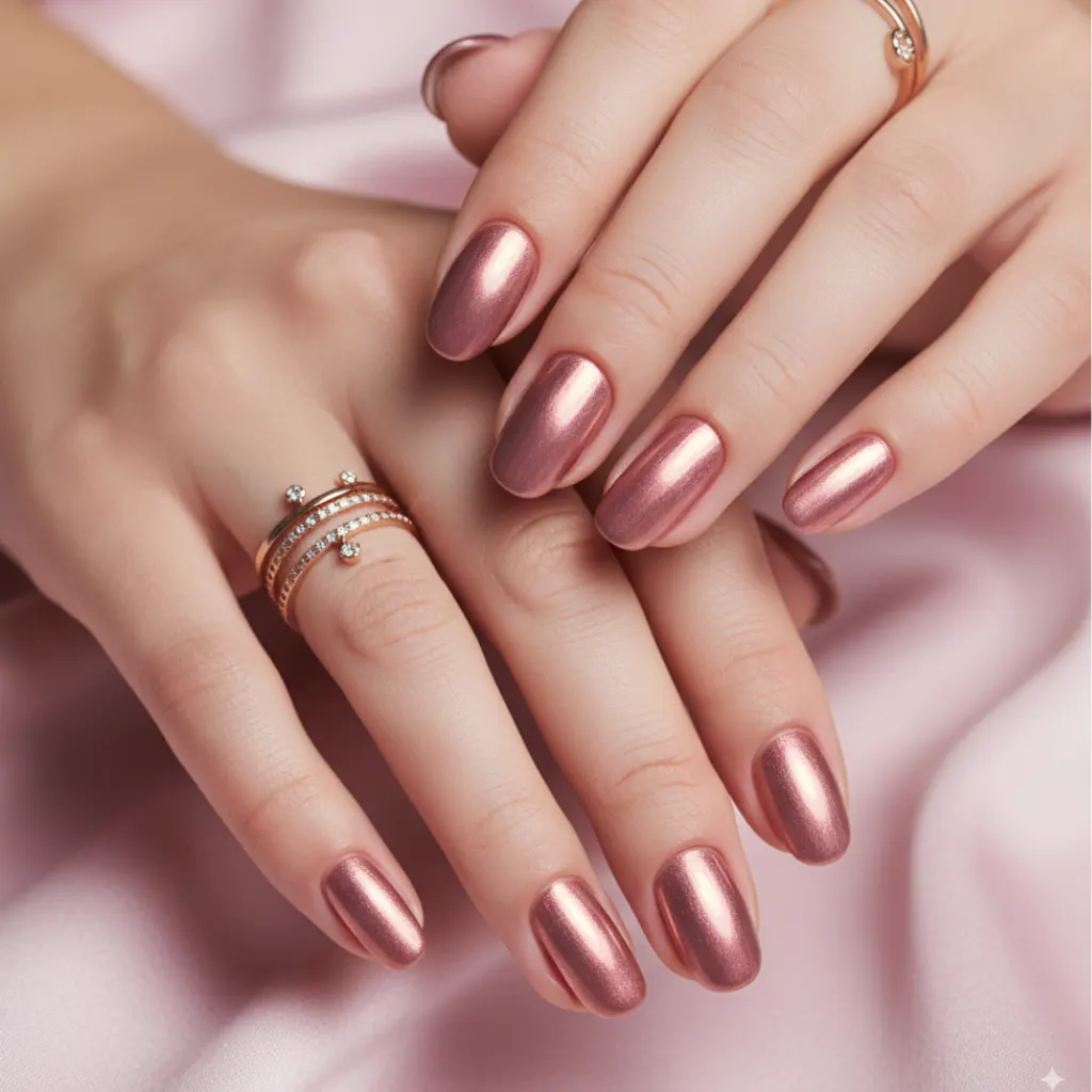 Dusty rose gold emerges as fall 2025’s most romantic metallic option, offering a softer alternative to traditional gold or copper that perfectly captures autumn’s gentle side. This muted metallic combines the warmth of rose gold with grey undertones that prevent it from reading too pink or summery. The result is a sophisticated shimmer that adds glamour without overwhelming, making it perfect for both special occasions and everyday wear. On short nails, dusty rose gold creates an elegant, lengthening effect thanks to its light-reflecting properties, while maintaining a subtlety that works in professional settings.