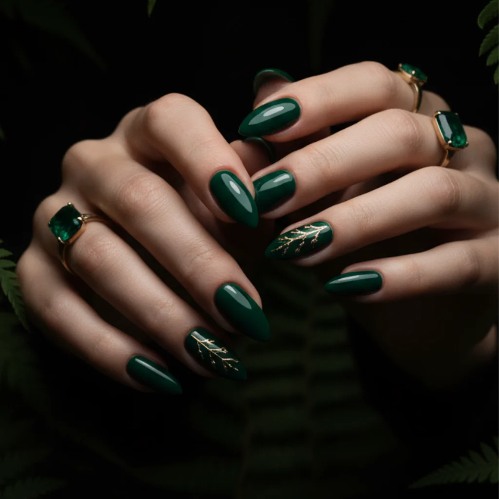 Deep forest green commands attention as one of fall 2025’s most dramatic choices, offering a rich alternative to black that feels both edgy and natural. This intense shade captures the depth of evergreen forests while maintaining a sophistication that works for any occasion. The key to modern forest green is finding shades with subtle blue or grey undertones that prevent the color from reading too Christmas-like. On both short and almond nail shapes, forest green creates a striking look that pairs beautifully with fall’s neutral wardrobe palette while adding an element of unexpected drama.
