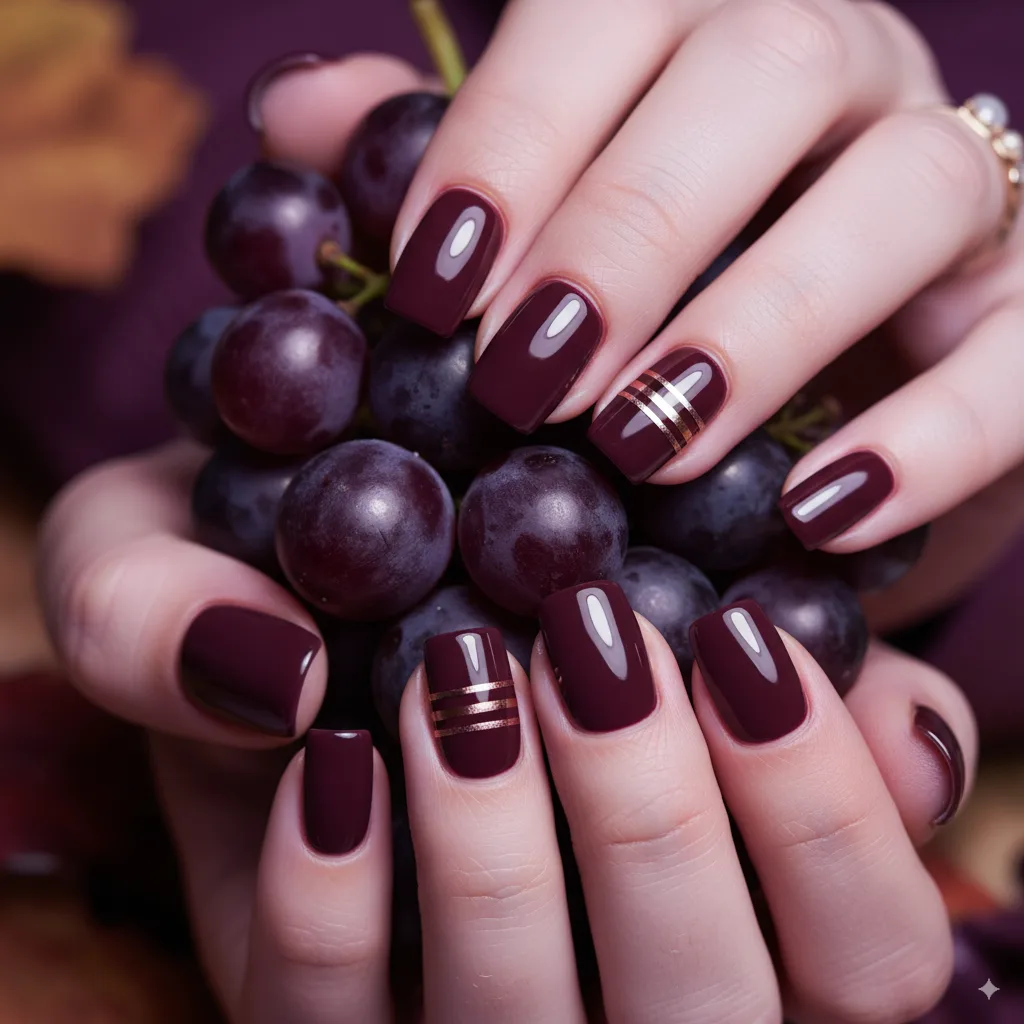Blackberry purple stands out as one of autumn nail colors 2025’s most luxurious options, offering a deep, complex shade that straddles the line between purple and black. This rich tone captures the essence of fall’s darker fruits while maintaining a vibrancy that pure black lacks. The multi-dimensional quality of blackberry purple means it can appear different in various lighting – sometimes reading as deep purple, other times as near-black with purple undertones. This chameleon-like quality makes it an exciting choice for those who want depth without committing to solid black.