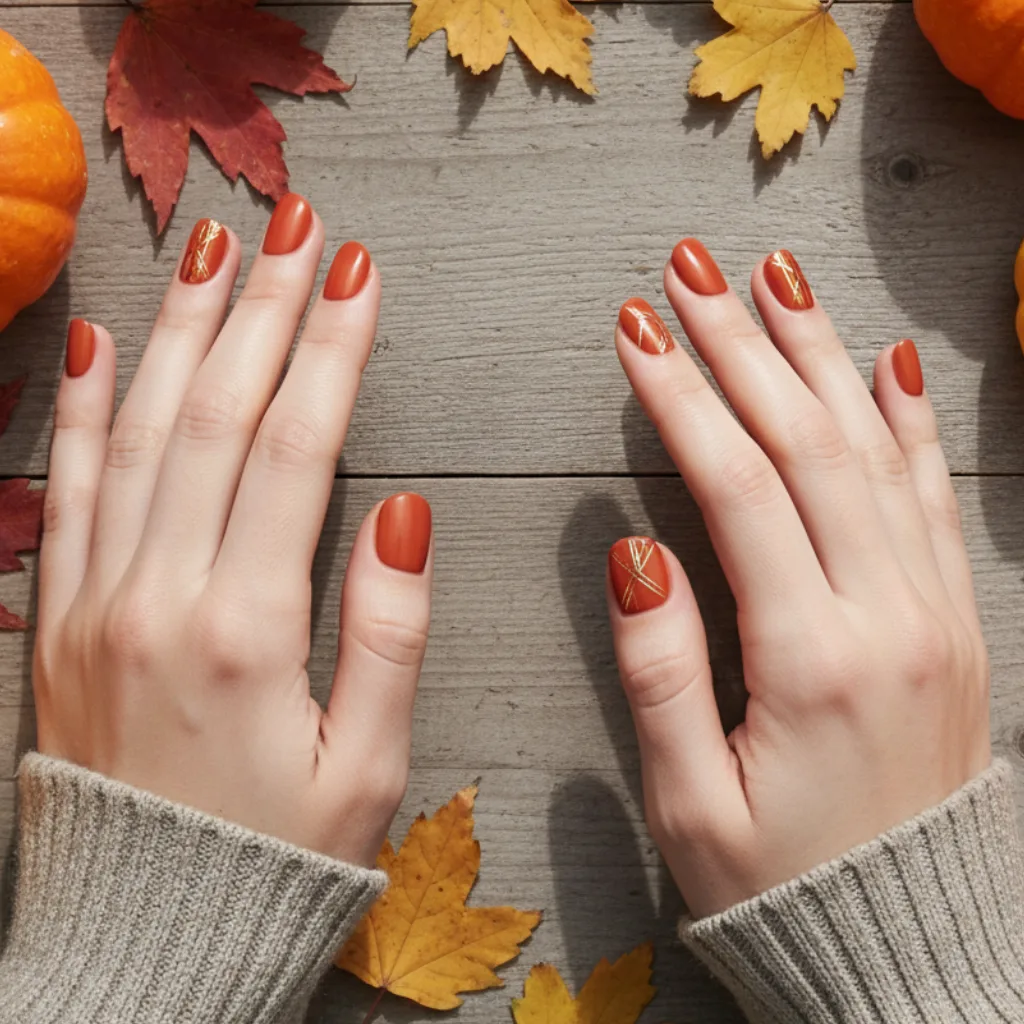 Terracotta clay brings the warmth of sun-baked earth to fall 2025’s nail trends, offering a unique orange-brown hybrid that feels both fresh and timeless. This earthy shade captures the essence of pottery and desert landscapes while remaining perfectly suited to autumn’s aesthetic. The muted quality of terracotta makes it more wearable than bright orange while still providing enough color to feel special. Short nails benefit from terracotta’s grounding effect, creating a look that’s polished yet approachable, perfect for those who want to embrace fall colors without going too bold.