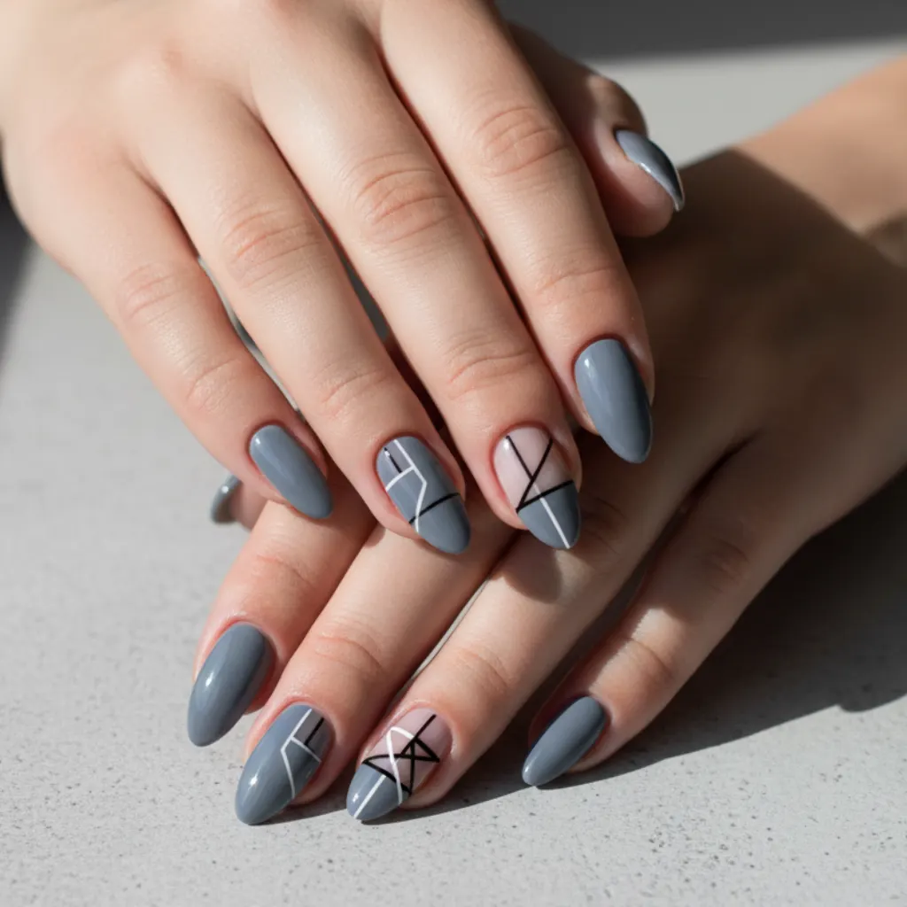 For almond nail designs, smoky grey-blue serves as an excellent base for exploring negative space techniques. Create geometric cutouts that reveal the natural nail, or use the shade to frame abstract shapes in complementary colors. Modern fall manicure styles featuring smoky grey-blue often incorporate metallic accents – thin silver stripes, pewter dots, or gunmetal geometric shapes that enhance the color’s cool undertones. Another trending approach involves creating marble effects by swirling smoky grey-blue with white and black, resulting in a stone-like pattern that feels both natural and luxurious. This sophisticated shade proves that autumn nail colors 2025 can embrace cooler tones while maintaining seasonal appropriateness.