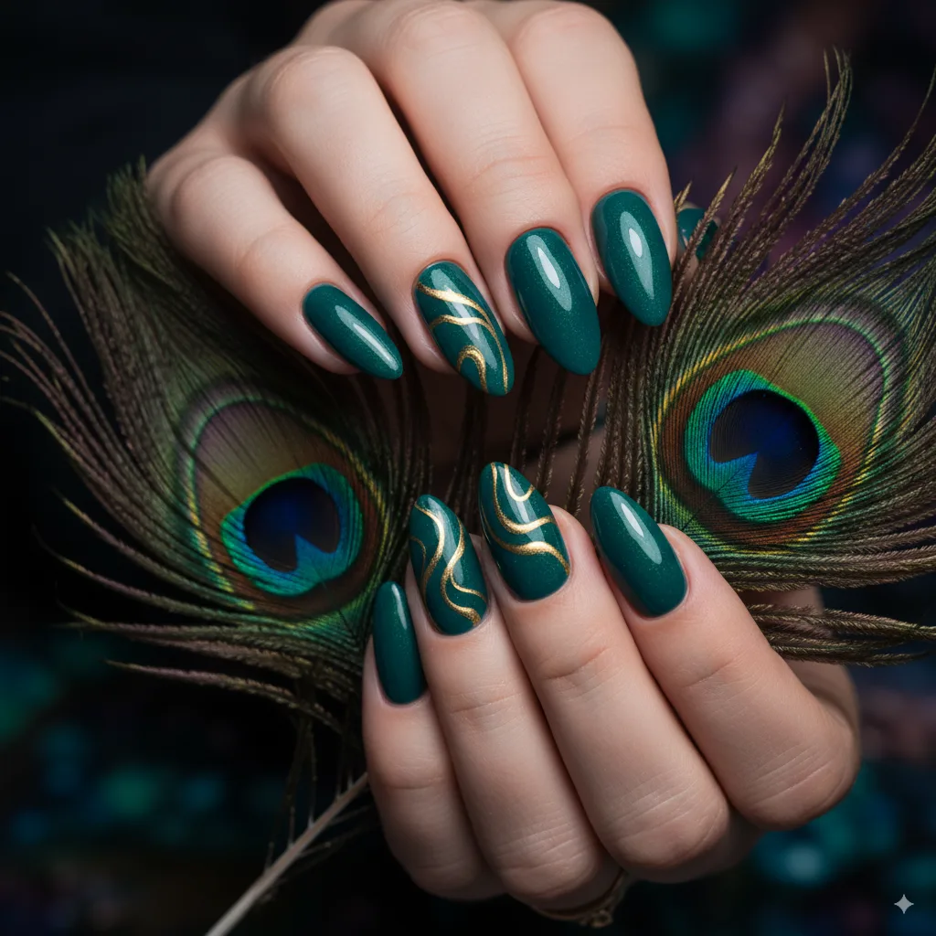 For stylish fall nails featuring deep teal-green, consider incorporating complementary metallics that enhance both the blue and green undertones. Gold accents bring out the warmth, while silver emphasizes the coolness, allowing you to customize the look based on your preference. Almond nails provide space for creative expression – try creating abstract wave patterns that play into the oceanic qualities, or geometric designs that emphasize the color’s modern appeal. Trending manicure ideas often feature deep teal-green in gradient designs, blending it with navy at the base and lighter teal at the tips for a dimensional effect that captures the depth of both sea and forest.