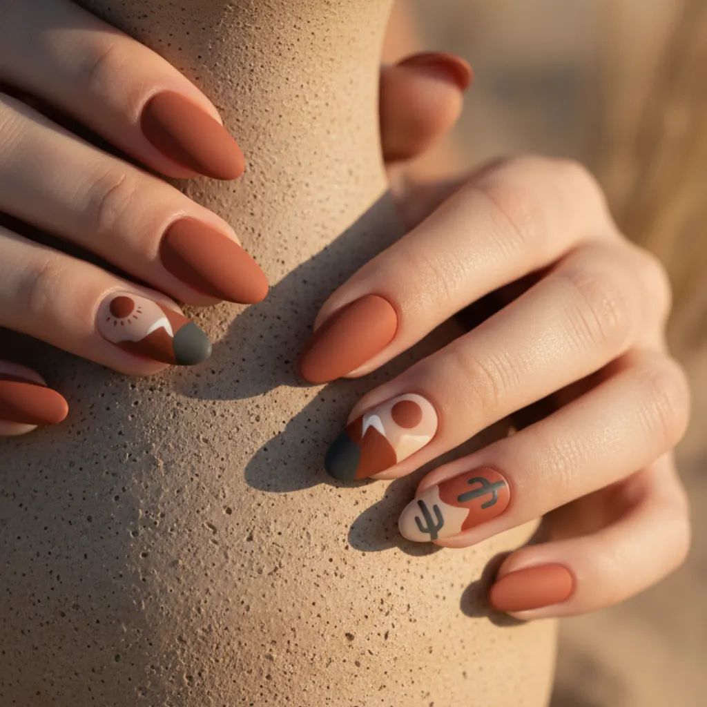 For almond nail designs featuring terracotta, consider incorporating texture play that enhances the shade’s earthy qualities. Matte finishes particularly complement terracotta, creating a pottery-like effect that feels authentically artisanal. Modern fall manicure styles often combine terracotta with complementary desert-inspired shades – think sage green accents, cream negative space designs, or thin gold lines that mimic the natural striations found in clay. Another trending approach involves creating abstract landscape designs using terracotta as the base, adding touches of dusty pink, warm beige, and deep brown to create miniature desert scenes on each nail. This versatile shade works beautifully for those seeking stylish fall nails that feel both grounded and creative.