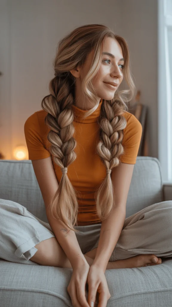 The sheer joyfulness of double Dutch braids in a beautifully dimensional blonde — I can’t look away. The braids are thick and full, hanging past the shoulders, with different tones of golden, honey, and ash blonde woven through each section like threads in a hand-knit textile. Face-framing pieces are left loose in soft, curtain-like waves. It’s one of the most charming spring blonde hair color ideas on this entire list, and the styling elevates the color into something genuinely artistic.
