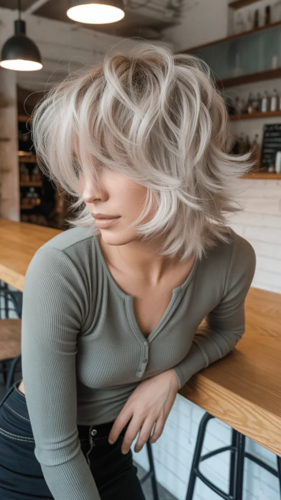 Wild, bold, unapologetically cool. This shaggy, layered cut in an icy platinum blonde with darker roots is pure rock-and-roll energy meets spring lightness. The hair falls across the face in dramatic, wind-swept pieces, with heavy layers creating volume and movement that feels alive. It’s one of the most daring stylish spring blonde hair color looks 2026 on this list — not for the faint of heart, but absolutely for the fashion-forward.
