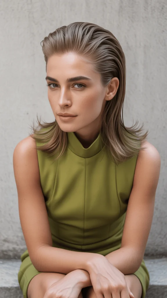 A strong-hold gel or styling cream is essential for the slicked-back portion. I’d recommend Ouai Matte Pomade for hold without shine at the roots, letting the natural sheen of the lengths speak for itself. A wide-tooth comb through wet hair sets the shape, and then air-drying or diffusing the ends creates that soft contrast between the sleek top and textured bottom. Color-wise, a warm gloss keeps this sandy shade from going flat.