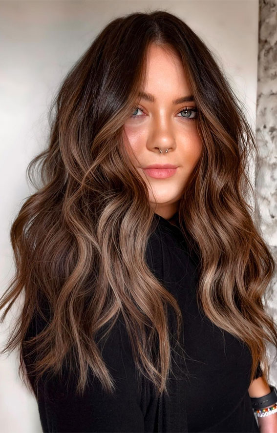 Soft brunette balayage layers lighter brown highlights over a brunette base for that sun-kissed vibe. It’s easy to care for and grows out super naturally.