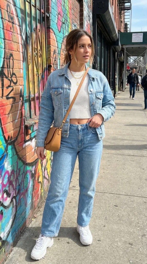 Underneath the denim jacket, a white graphic t-shirt adds personality and breaks up the blue, creating visual interest and making the outfit feel more intentional. This combination represents the essence of spring outfits casual styling—comfortable, easy to wear, and endlessly cool. The straight-leg jean silhouette is particularly flattering and on-trend for 2026, offering a relaxed fit that works for various body types while maintaining a polished appearance.