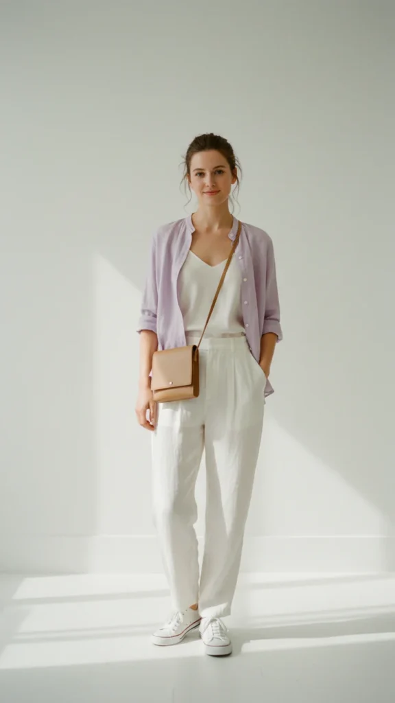 Soft lavender brings serene sophistication to this outfit featuring a pastel purple linen button-up shirt worn loosely over a white tank and paired with crisp white wide-leg linen pants. This combination captures the gentle, dreamy quality of spring outfits aesthetic that feels both romantic and contemporary. The lavender brings subtle color that’s more interesting than basic neutrals while remaining soft and approachable.