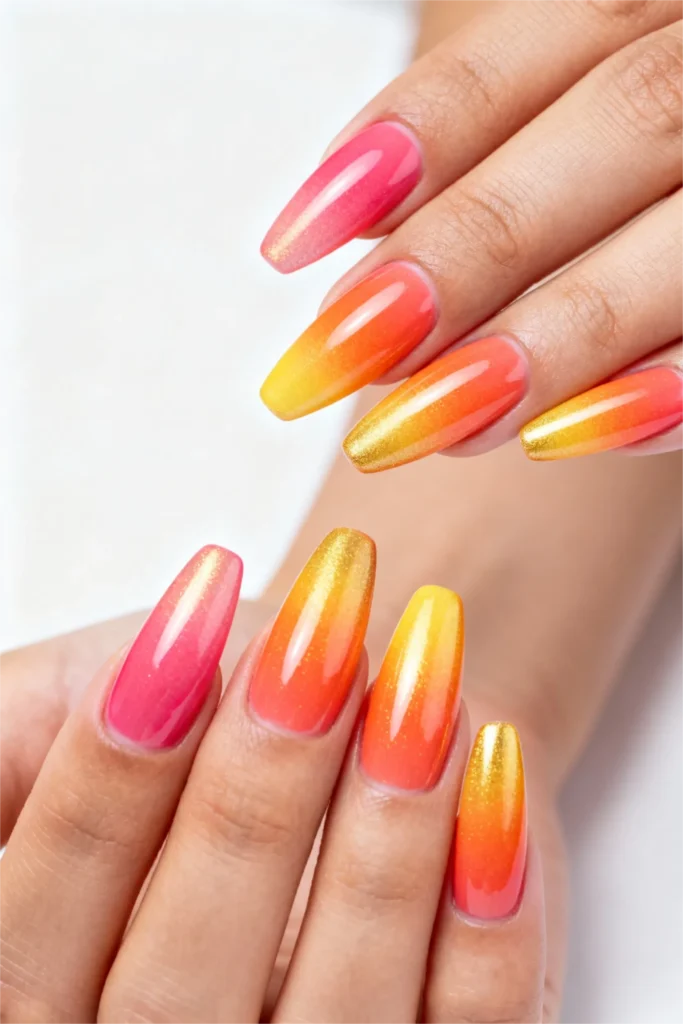 Perfect for beach vacations, summer festivals, or anyone who wants to carry bold, joyful energy wherever they go, these neon mix nail designs guarantee you’ll never lose track of your hands. The warm color palette flatters warm and neutral skin tones beautifully and pairs wonderfully with gold jewelry and tropical prints. For maximum summer impact and undeniable confidence, this sunset gradient delivers spectacular results.