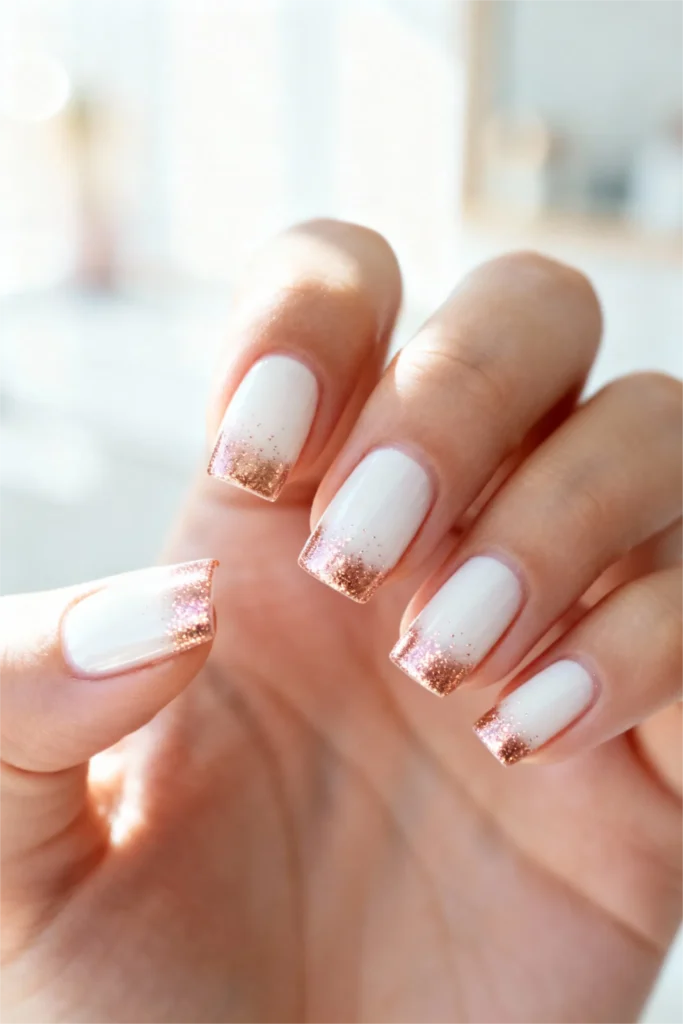 The rose gold glitter catches light beautifully, creating a champagne-like sparkle that feels celebratory yet sophisticated. Unlike traditional stark white French tips, this warm metallic approach feels contemporary and fashion-forward. It’s an excellent example of how simple gel nail ideas can be elevated through strategic color choices and thoughtful application techniques.