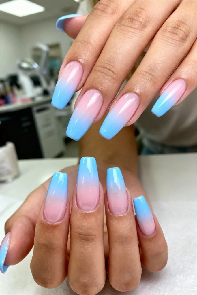 Ocean blue ombre gel nails represent the pinnacle of gel nails 2026 summer sophistication. This long gel nails design features a seamless transition of blue shades that mimics the depth and movement of ocean water. The coffin shape provides the perfect elongated canvas for the gradient effect to truly shine, creating a mesmerizing visual that captures attention without overwhelming.