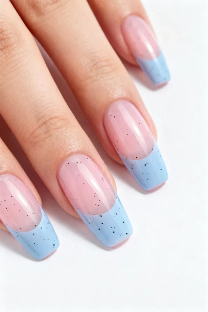 Baby blue ombre gel nails meet soft pink in this whimsical speckled design. The long, square-shaped nails feature a gentle gradient from blush pink at the base to baby blue at the tips, with delicate black speckles scattered throughout like artistic freckles. This playful yet sophisticated combination represents the perfect marriage of cute gel nail designs and contemporary nail art trends.