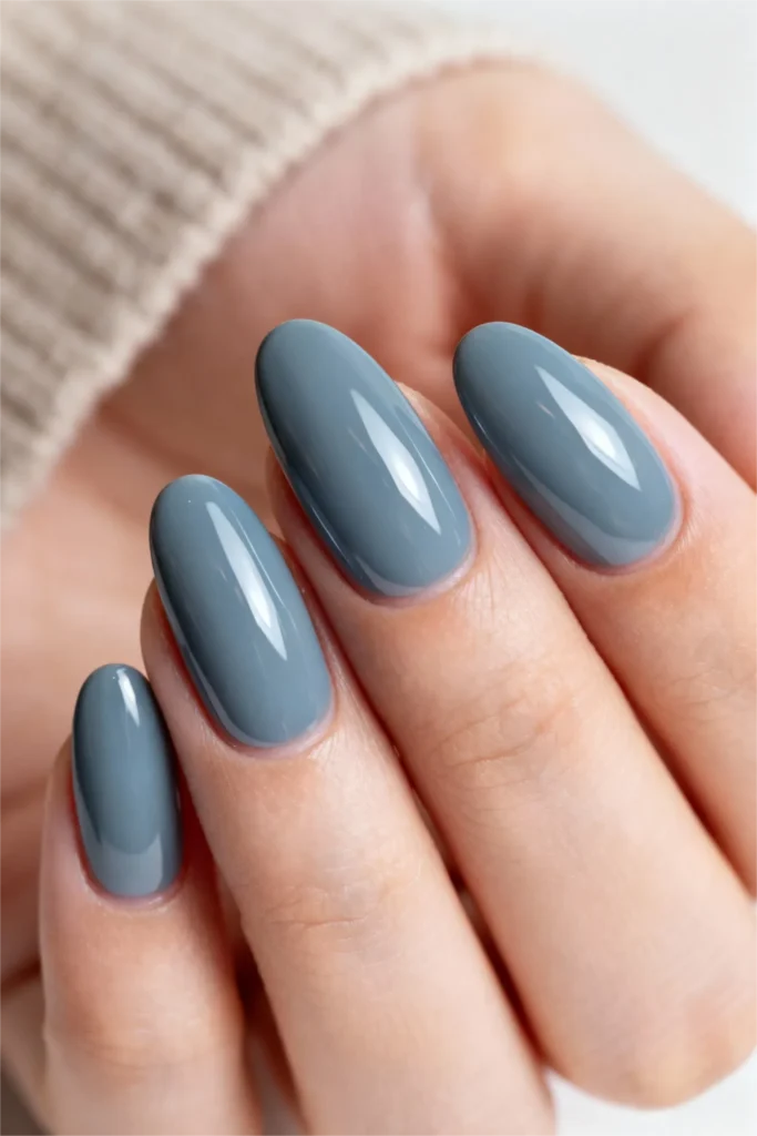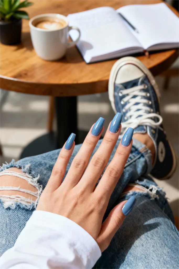 What makes this one of the most versatile gel nail ideas is its chameleon-like quality—appearing different under various lighting conditions. In natural daylight, the dusty blue tone reveals soft gray undertones, while indoor lighting brings out its true serene blue character. This simple gel nail idea proves that you don’t need elaborate designs to make an impact.
