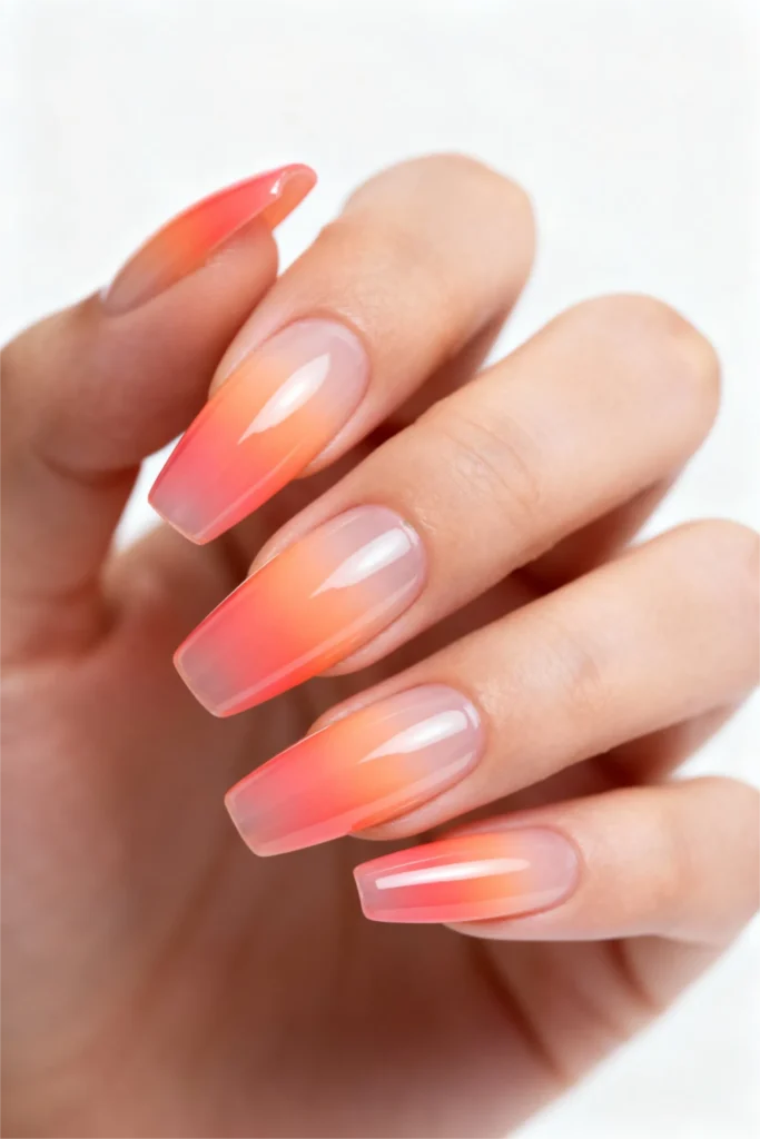 Coral pink ombre gel nails offer a warmer take on traditional pink manicures. These long gel nails feature a beautiful gradient from nude at the base to vibrant coral-pink at the tips, creating a sun-kissed effect that feels inherently summery. The coffin shape provides an elegant foundation for this smooth color transition, making it one of the most flattering gel nails 2026 summer designs.