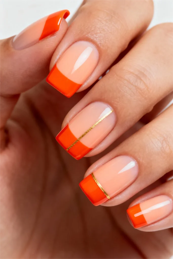 Neon orange French gel nails bring electric energy to traditional nail art. This bold design features a nude base with vibrant neon orange tips, and strategic gold striping tape that adds a luxurious accent line. The square shape provides a modern foundation for this eye-catching color combination, making it one of the standout bold summer nails designs for 2026.