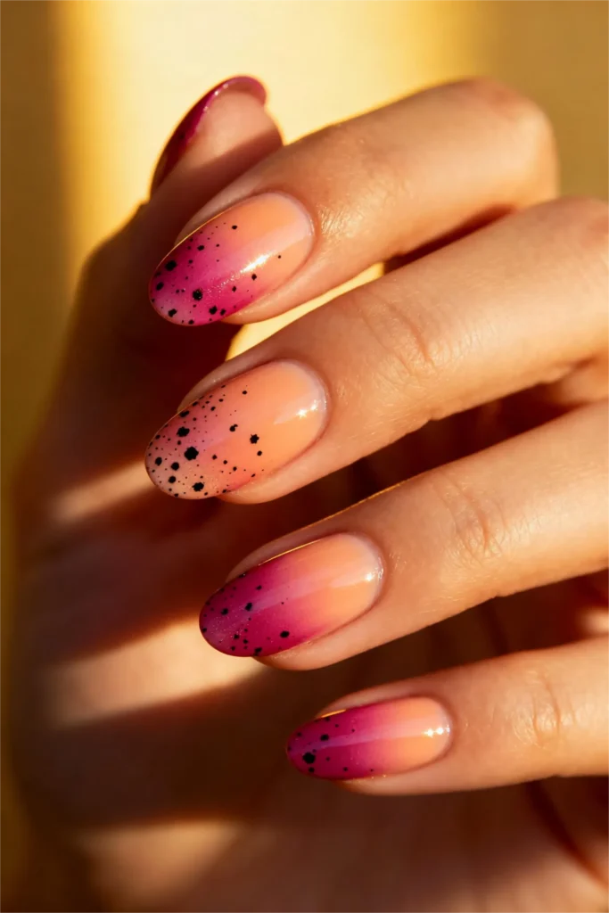 Pink ombre gel nails take an artistic turn with unexpected black speckle detailing. This almond-shaped design features a gorgeous gradient that transitions from peachy nude at the base to deeper coral-pink at the tips, with random black speckles scattered across the ombre for contemporary edge. It’s a perfect fusion of soft femininity and modern artistic expression.