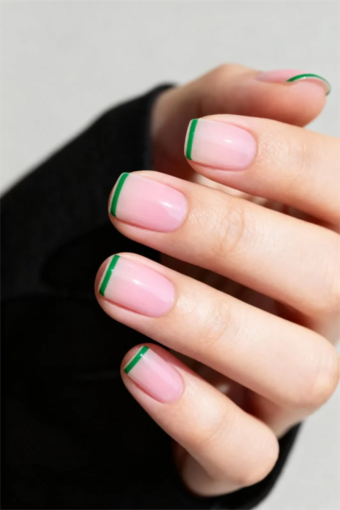 Pink and green French gel nails offer an unexpected color combination that surprisingly works beautifully. This short gel nails design features a soft pink base with clean emerald green tips, creating a fresh, spring-garden-inspired look. The square shape provides a modern foundation for this unconventional French tip variation, making it one of the most unique trendy gel nail designs for 2026.