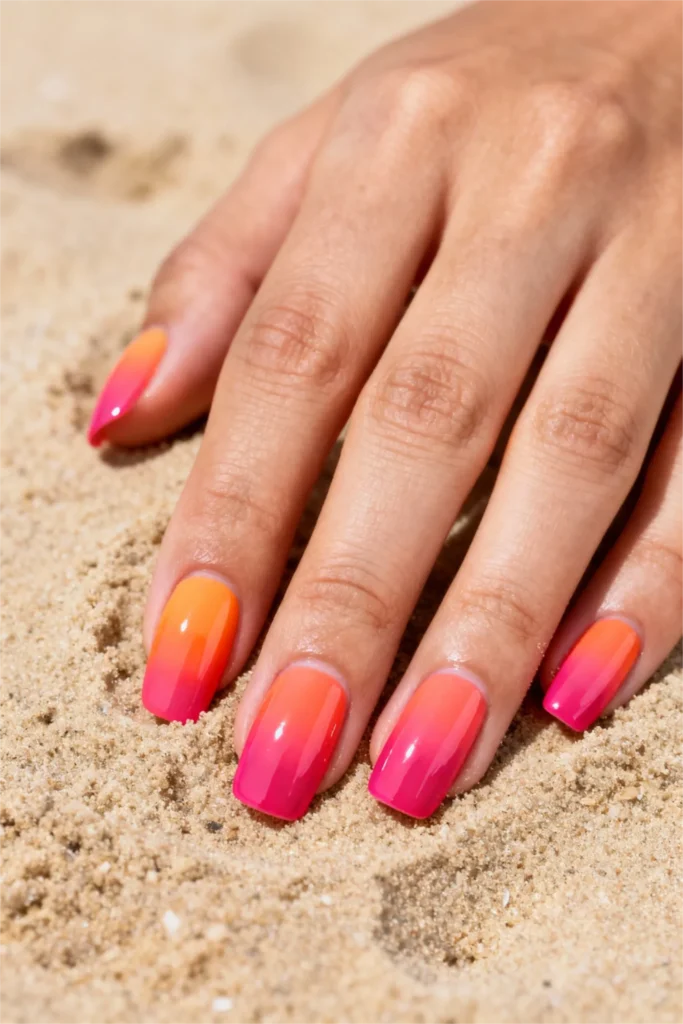 Sunset beach gradient gel nails bring vacation vibes to your everyday life. This square-shaped design features a warm gradient transitioning from coral-pink through vibrant orange to hot pink, capturing the intense, saturated colors of a tropical sunset. The bold color choices make these some of the most eye-catching bold summer nails for those who embrace color fearlessly.