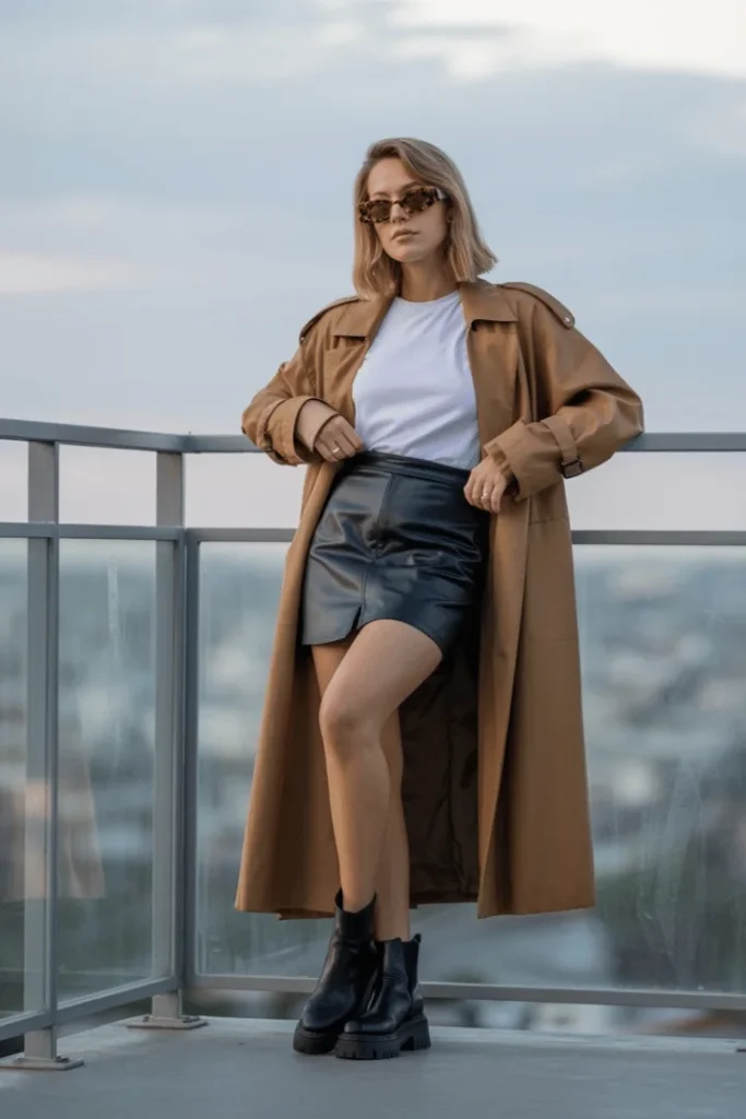 A camel trench coat is a wardrobe essential, and when paired with a black leather mini skirt and white tee, it becomes the ultimate spring power outfit. This is one of those stylish spring outfits 2026 that exudes confidence and sophistication, perfect for spring skirt outfits work or business casual spring skirt outfits. The long trench adds drama and structure, while the leather mini skirt brings edge and modernity. The simple white tee keeps the focus on the outerwear and creates a clean, minimalist aesthetic.