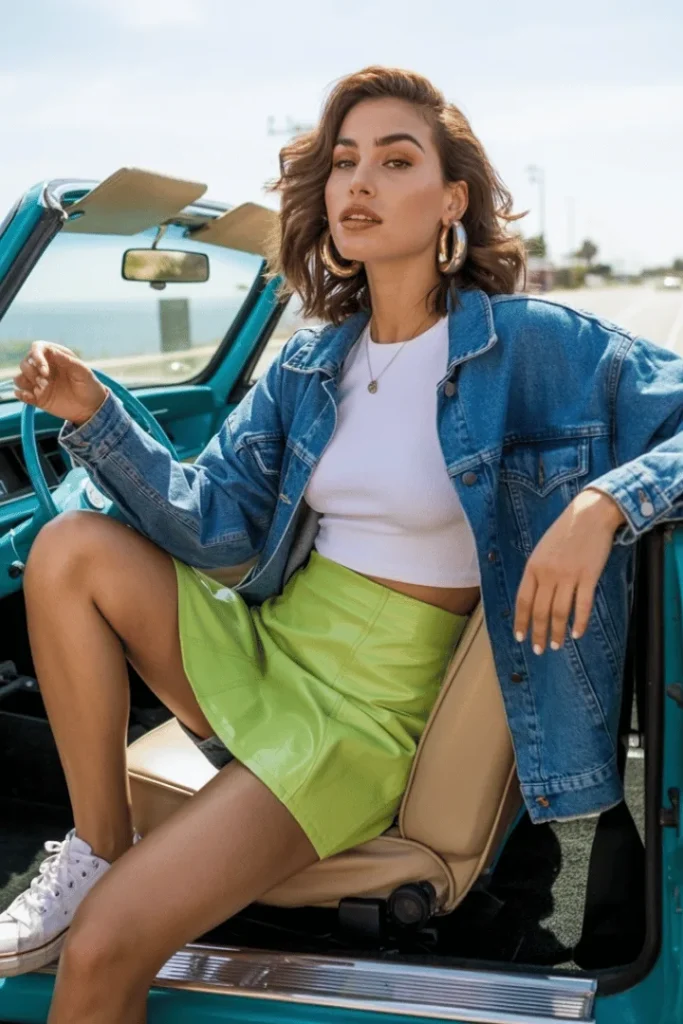 This outfit is ideal for spring skirt outfits casual with maximum impact. The lime green color is having a major moment in 2026, bringing a fresh, optimistic energy to your wardrobe. The denim jacket is a versatile layering piece that works with almost everything, making it a smart investment for your spring closet. The oversized fit of the jacket creates a relaxed silhouette that balances the fitted skirt beautifully.
