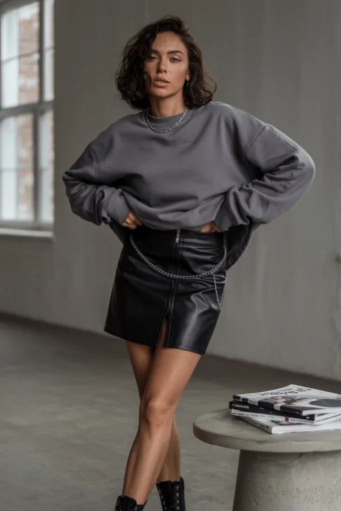 Oversized Gray Sweatshirt and Black Leather Skirt