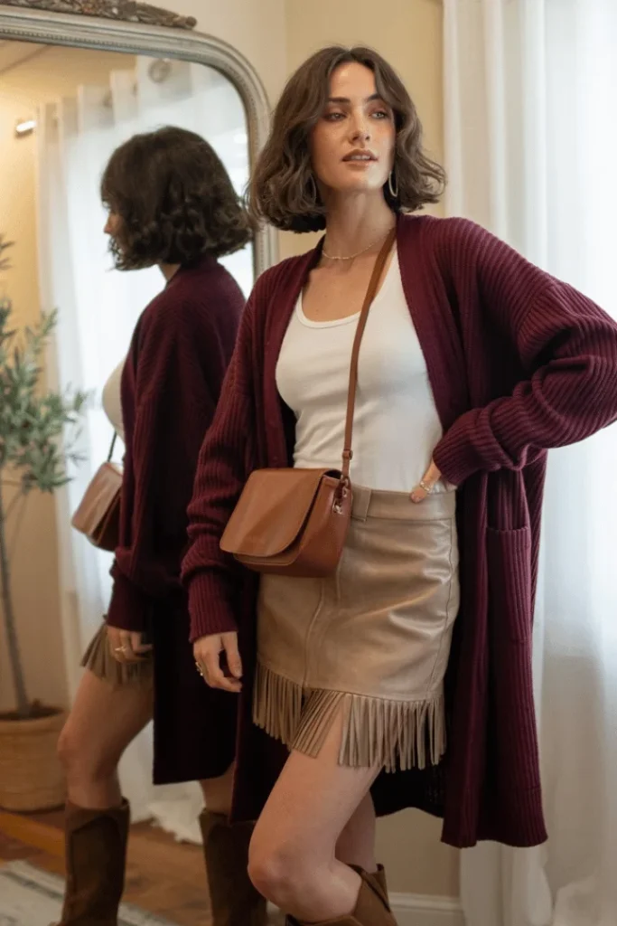 This outfit is a masterclass in mixing textures and tones. A long burgundy ribbed cardigan is layered over a white fitted tank and paired with a tan fringe mini skirt. This is one of those classy spring skirt outfits that feels bohemian and romantic, perfect for spring skirt outfits casual with an artistic edge. The fringe detail on the skirt adds movement and a hint of Western-inspired flair, while the rich burgundy cardigan provides warmth and a pop of color.