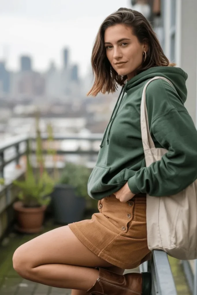Corduroy is having a renaissance, and this tan button-front mini skirt paired with a forest green hoodie is the perfect way to embrace the trend. This is one of those spring skirt outfits casual that feels cozy and approachable, ideal for laid-back weekends or outdoor adventures. The earthy tones create a natural, grounded palette that’s perfect for spring, while the corduroy texture adds visual interest and a retro vibe. Layer a cream tote bag over your shoulder and slip into brown ankle boots for a look that’s equal parts practical and stylish.